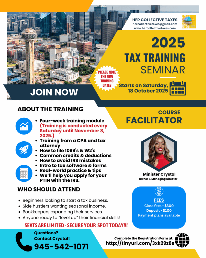 Her Collective Taxes proudly present the 2025 Tax Training Seminar. This is a six-week training module with online and in-person training. This training seminar is great for beginners looking to start a tax business, for those wanting additional or seasonal income, bookkeepers looking to fine tune their skills, and/or great for anyone ready to “level up”! You will receive valuable training from a C.P.A. and tax attorney.